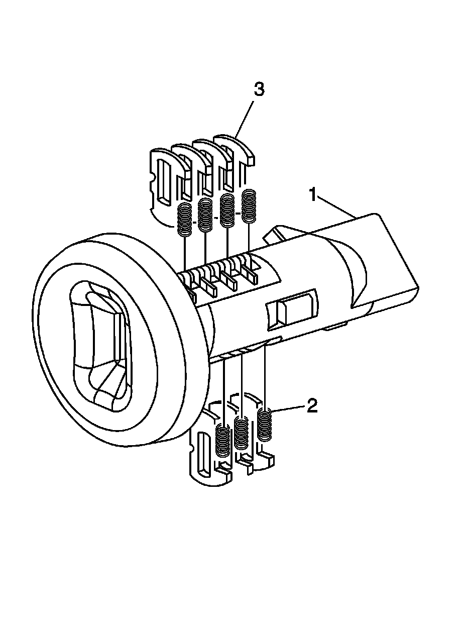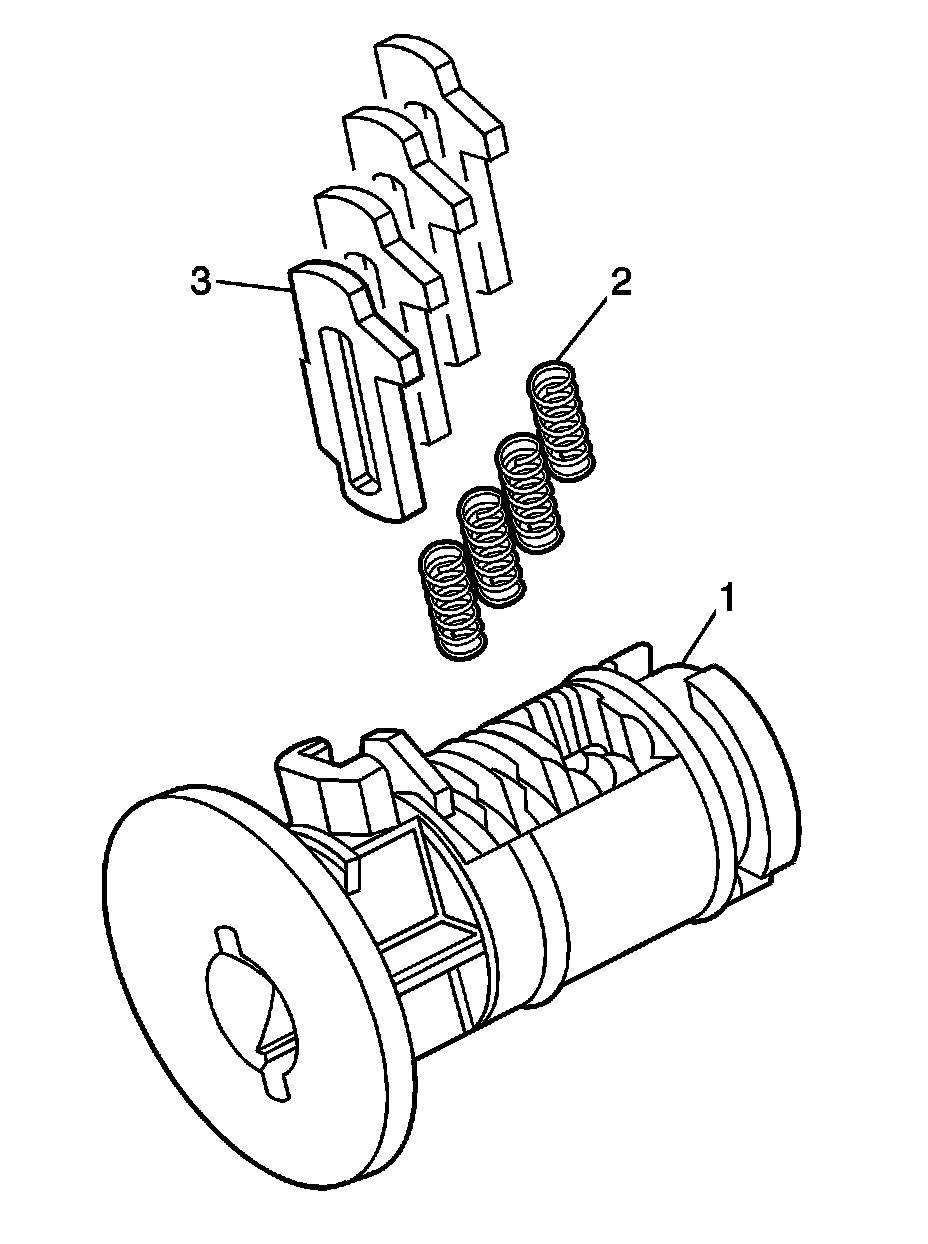 The ignition lock cylinder only uses 7 of the 10 cut positions, 2 through 8. The ignition cylinder tumblers (3) are located on alternate sides of the cylinder (1). They are snap-in and self-retaining. It follows the key code with the first tumbler being the first depth of the key code, closest to the head of the key.