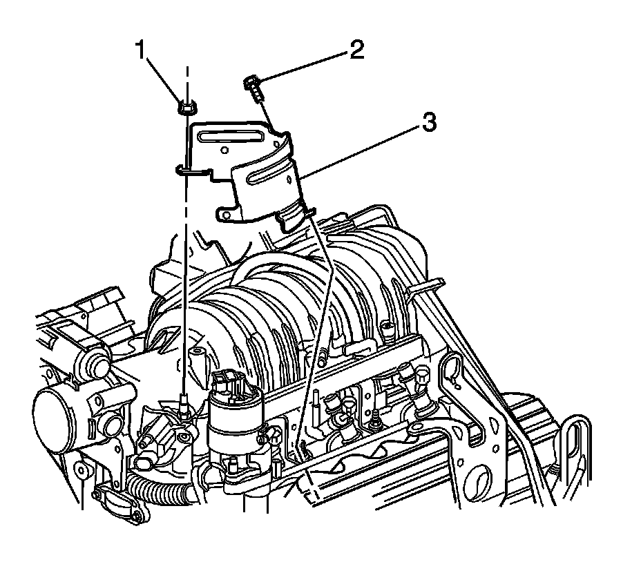10. Install the EGR valve wiring harness heat shield (3), the nut (1) and the bolt (2).