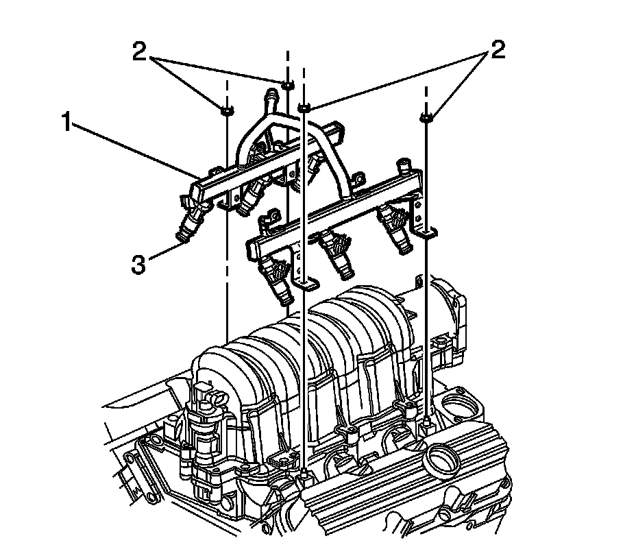 12. Remove the fuel rail assembly (1) with the fuel injectors (3).