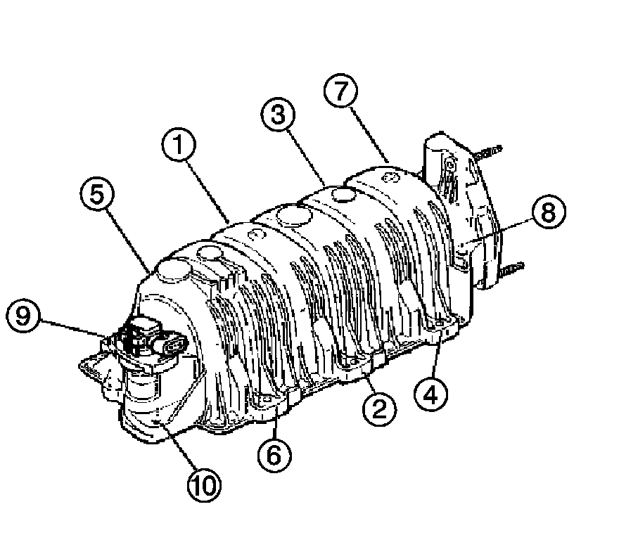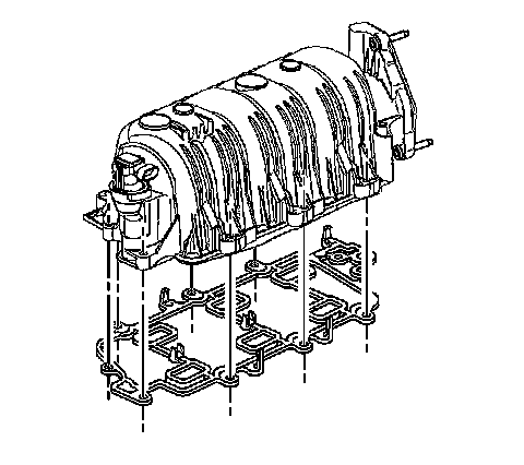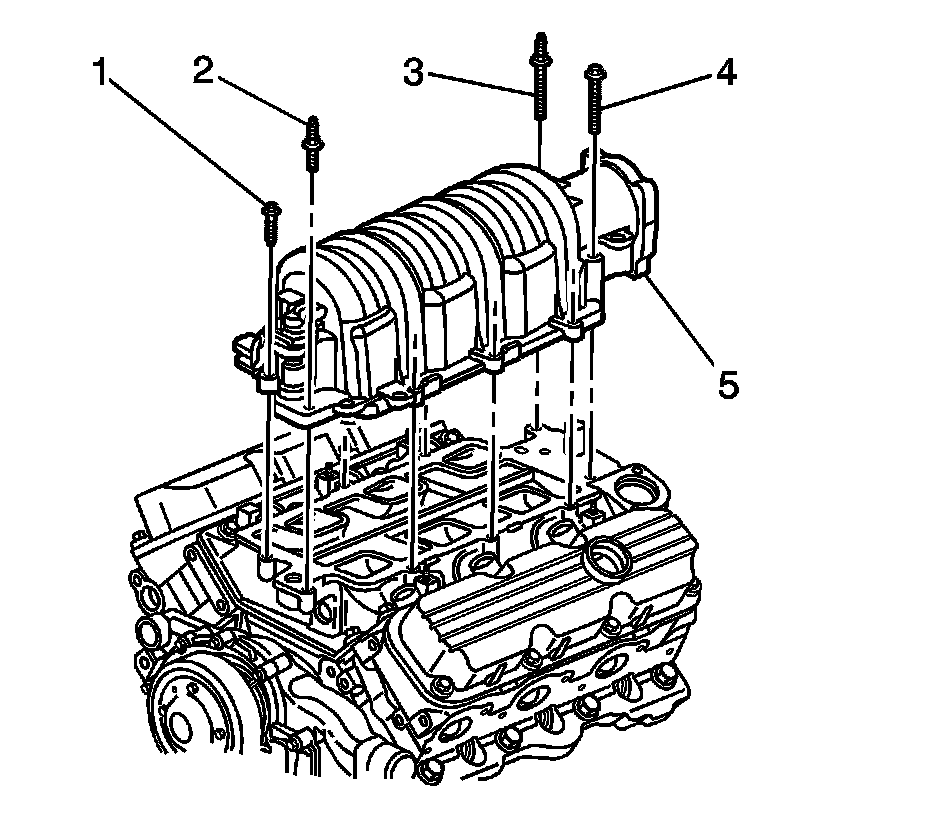 3. Carefully install the upper intake manifold (5) onto the lower intake manifold. Ensure that the alignment pins in the upper intake manifold align with the holes in the lower intake manifold.