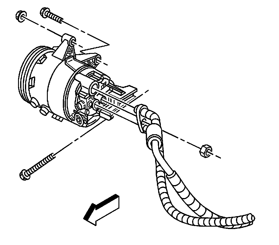2. Position the A/C compressor onto the front A/C compressor mounting stud and the rear A/C compressor mounting bolt.