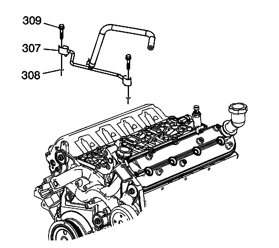 5. Remove the coolant air bleed pipe (307) with hose and seals (308).