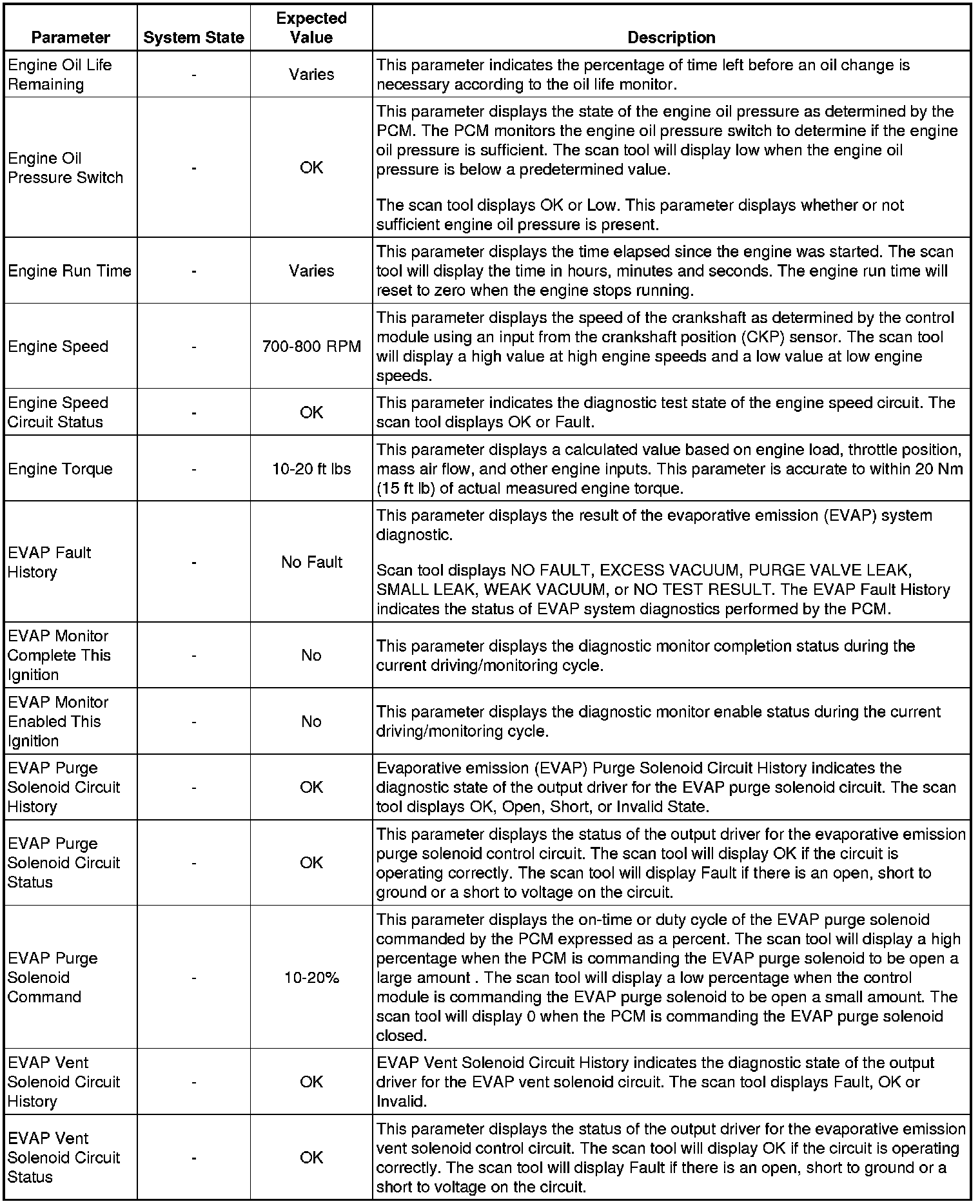 The scan tool values from a properly running engine may be used for comparison with the engine you are diagnosing. The Engine Scan Tool Data List represents values that would be seen on a normally running engine.