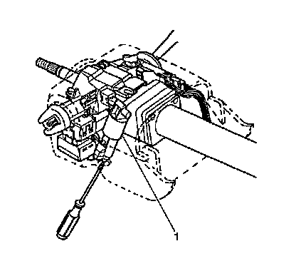 9. Use the screwdriver to push up on the manual override of the steering wheel theft deterrent lock (1).