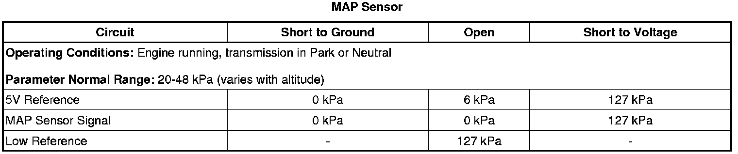 The MAP sensor has a 5V reference circuit, a low reference circuit, and a signal circuit. The engine control module (ECM) supplies 5V to the MAP sensor on a 5V reference circuit, and provides a ground on a low reference circuit. The MAP sensor provides a voltage signal to the ECM on a signal circuit relative to the intake manifold pressure changes.