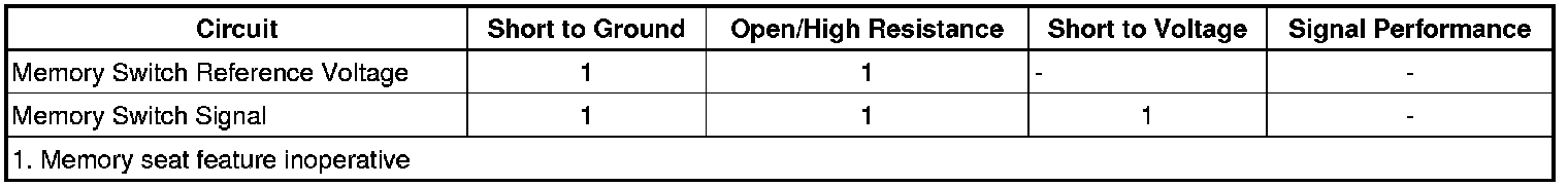 Reference voltage is supplied to the memory switch from the driver door module (DDM). When a memory switch is pressed, reference voltage is applied through the switch contacts, a series of resistors and thorough the memory switch signal circuit to the DDM. The DDM then sends a serial data message to the memory seat module (MSM) indicating the memory recall request. The MSM then commands the appropriate seat motors to move to the pre-recorded seat positions stored in memory in response to the switch input.