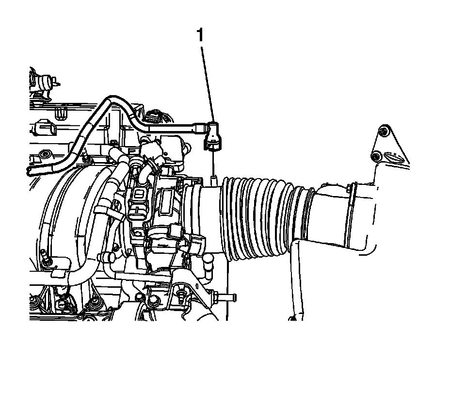 2. Disconnect the positive crankcase ventilation (PCV) tube quick connect fitting (1) from the air cleaner outlet duct. Refer to Plastic Collar Quick Connect Fitting Service (Plastic Collar Quick Connect Fitting Service).