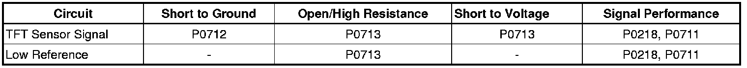 * DTC P0713 detects a continuous open or short to voltage in the TFT sensor signal circuit of the TFT sensor.