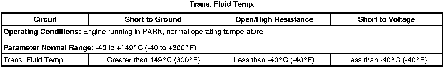 * Start the engine. With the vehicle in PARK and at normal operating temperature, observe the Trans. Fluid Temp. parameter on the scan tool. The Trans. Fluid Temp. should display near the ECT sensor parameter.