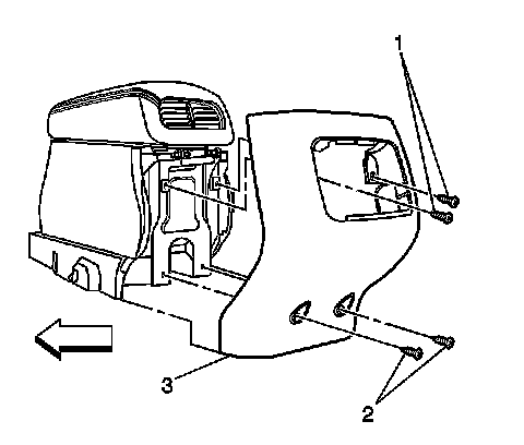 1. Remove the floor console rear cover (3) screws (1), located under the rear auxiliary HVAC control.