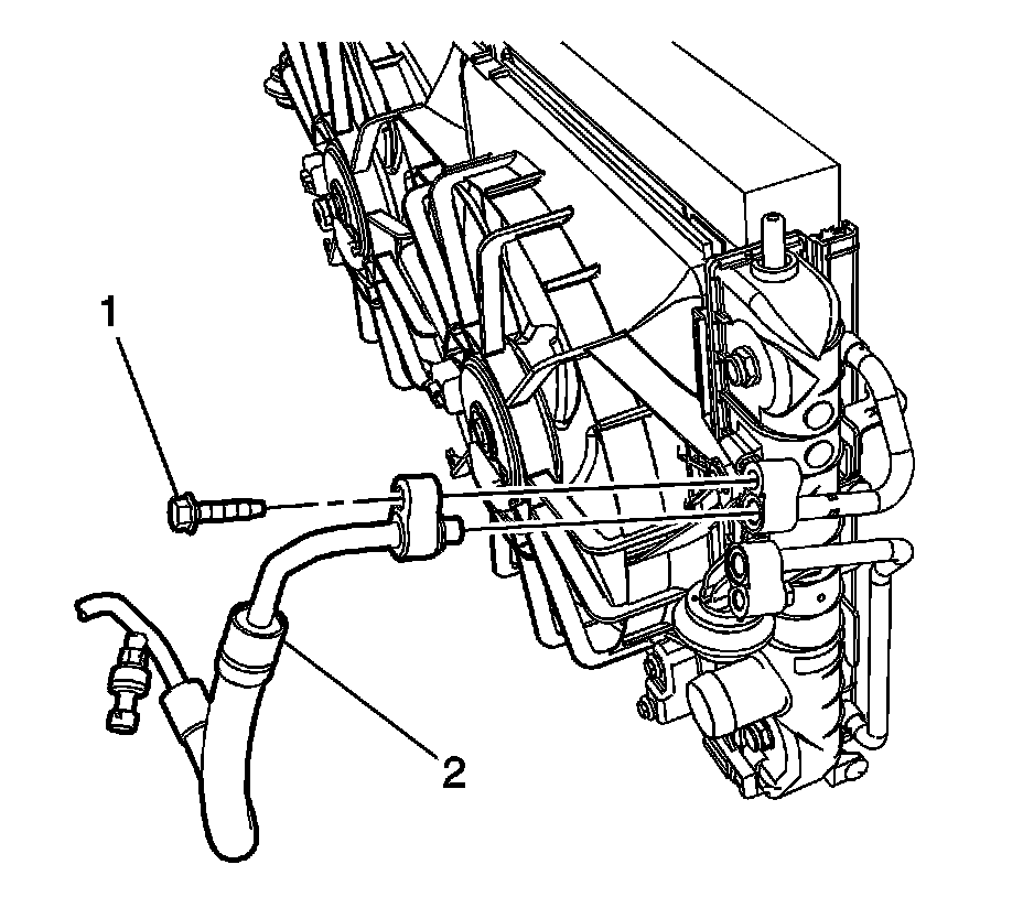 3. Install the condenser line to radiator mounting bolt (1) and tighten to 6 Nm (53 lb in).