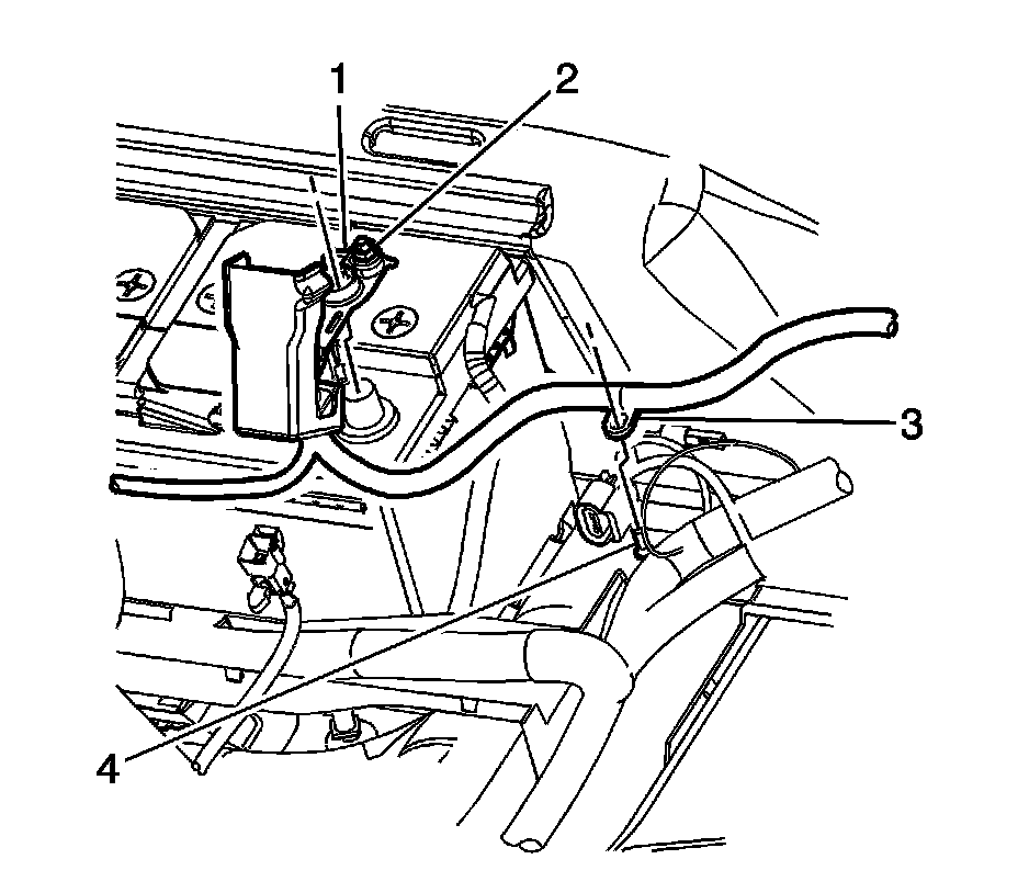 11. Remove the positive battery cable clips (2, 3, and 4) from the body harness retainers.