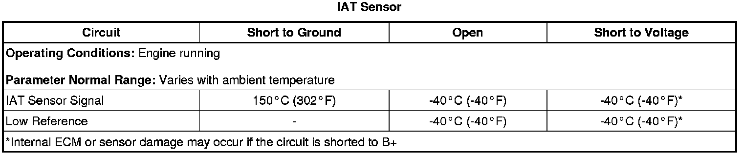 The ECM detects that the IAT sensor signal is warmer than 149°C (300°F) for at least 7 s.