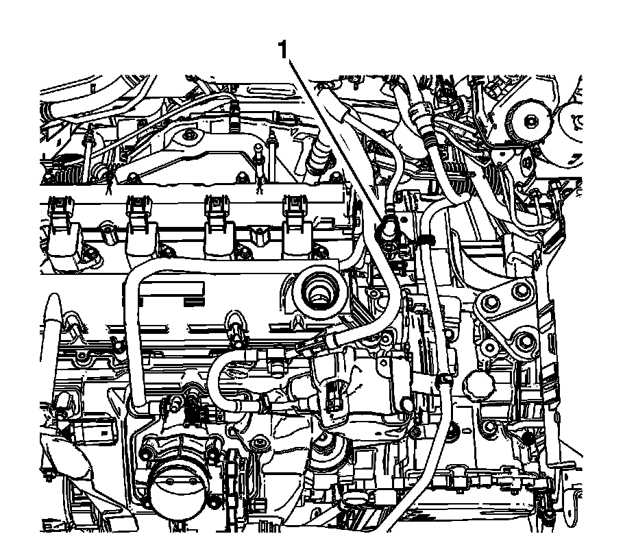 9. Disconnect the evaporative emission (EVAP) line quick connect fitting (1) from the EVAP purge solenoid. Refer to Plastic Collar Quick Connect Fitting Service Service and Repair.