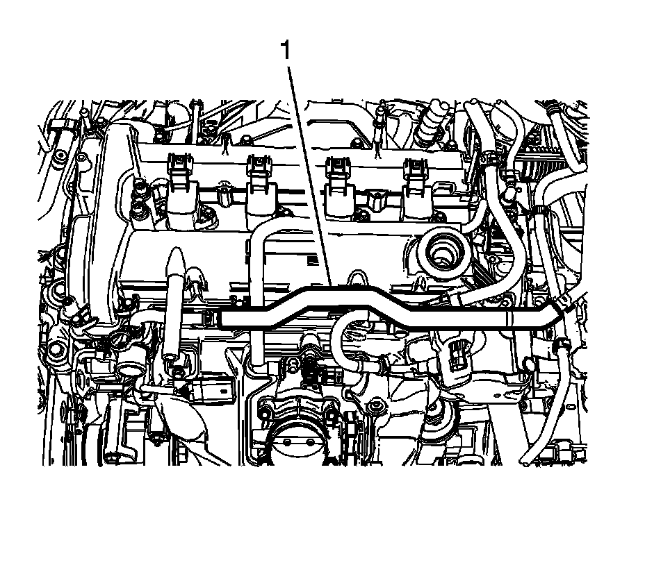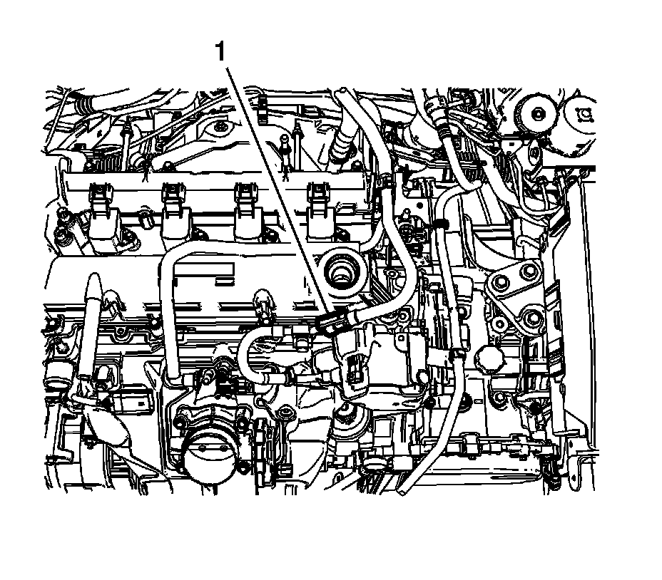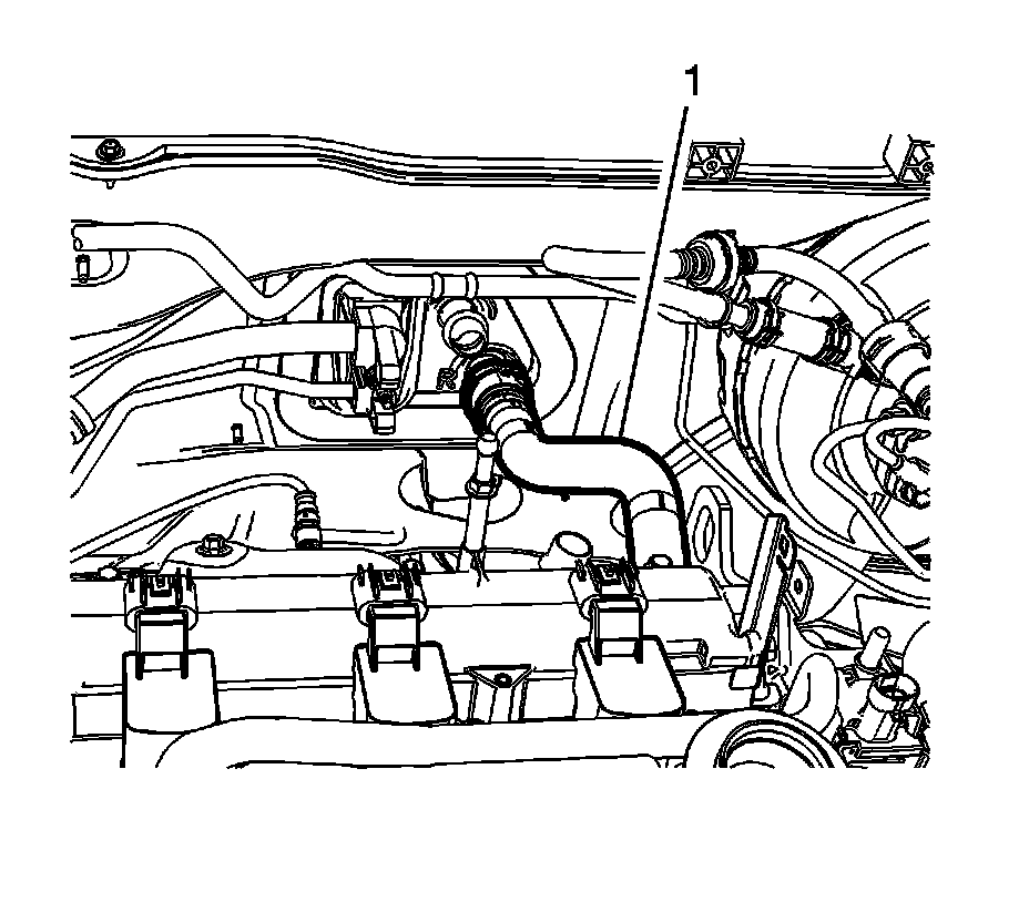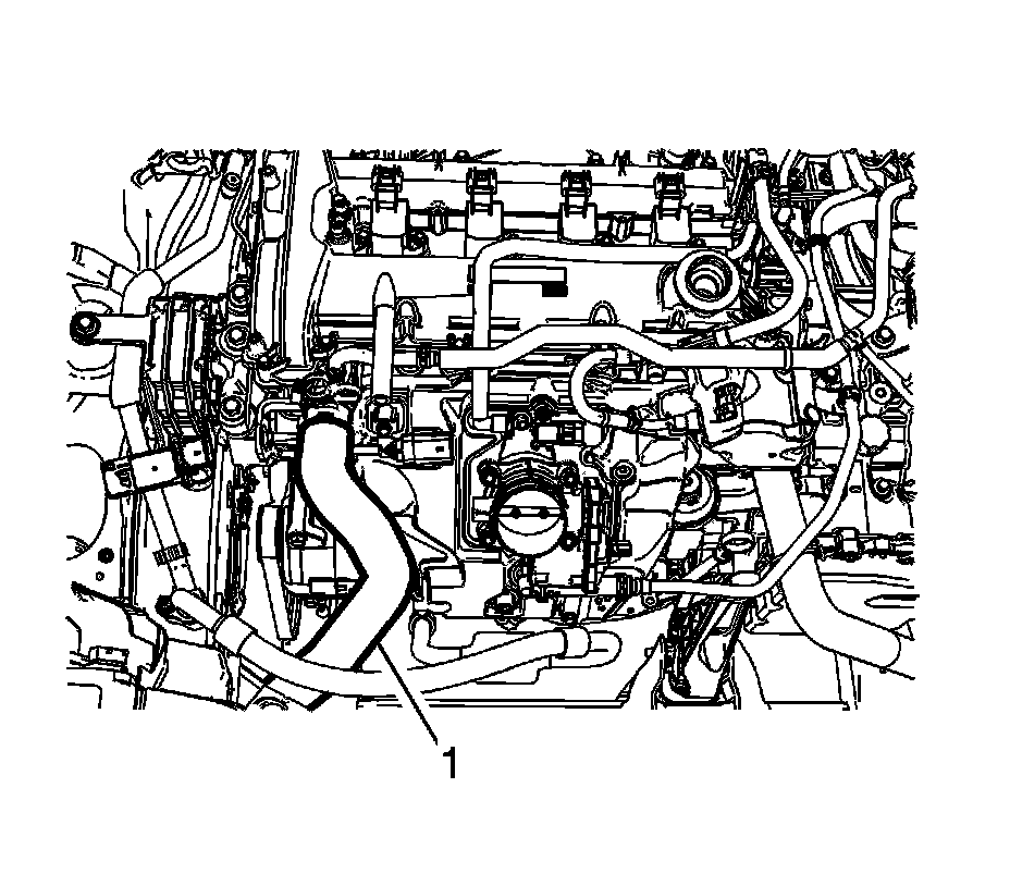 14. Remove the radiator inlet hose (1). Refer to Radiator Inlet Hose Replacement (LUK) Radiator Inlet Hose Replacement (LUK)Radiator Inlet Hose Replacement (LHU) Radiator Inlet Hose Replacement (LHU)Radiator Inlet Hose Replacement (LEA) Radiator Inlet Hose Replacement (LEA).
