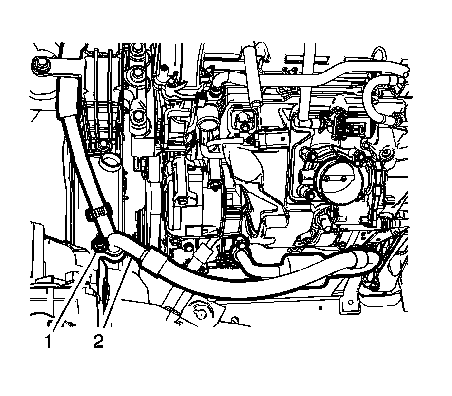 10. Release the clamp (1) and remove the power brake booster vacuum pipe (2) from the intake manifold vacuum port.