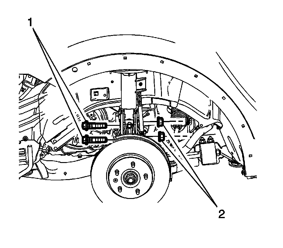 35. Remove the steering knuckle to strut bolts (1) and nuts (2). Refer to Strut Assembly Removal and Installation (GNA) Strut Assembly Removal and Installation (GNA).