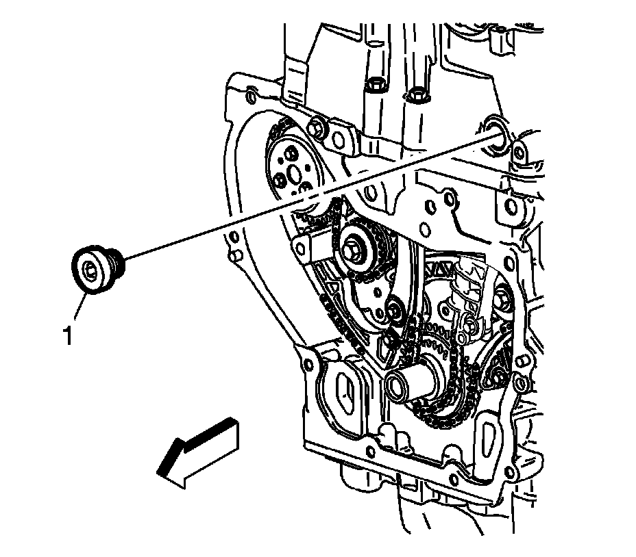 30. Install the timing chain guide bolt access hole plug (1). Tighten the access hole plug to 90 Nm (66 lb ft).