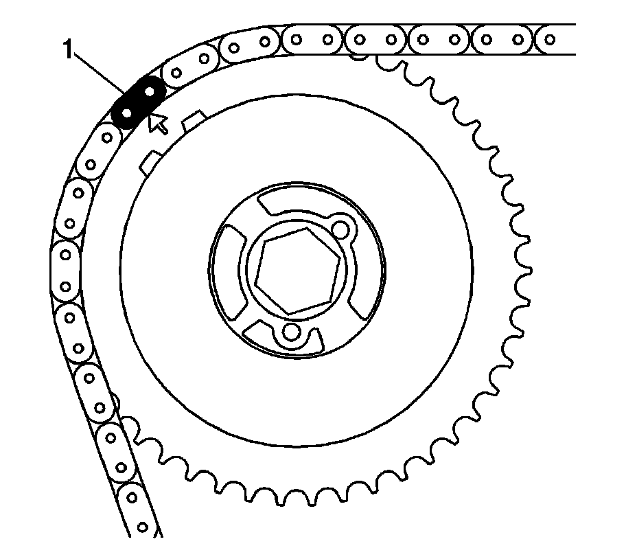 5. Assemble the intake camshaft actuator into the timing chain with the timing mark lined up with the uniquely colored link (1).