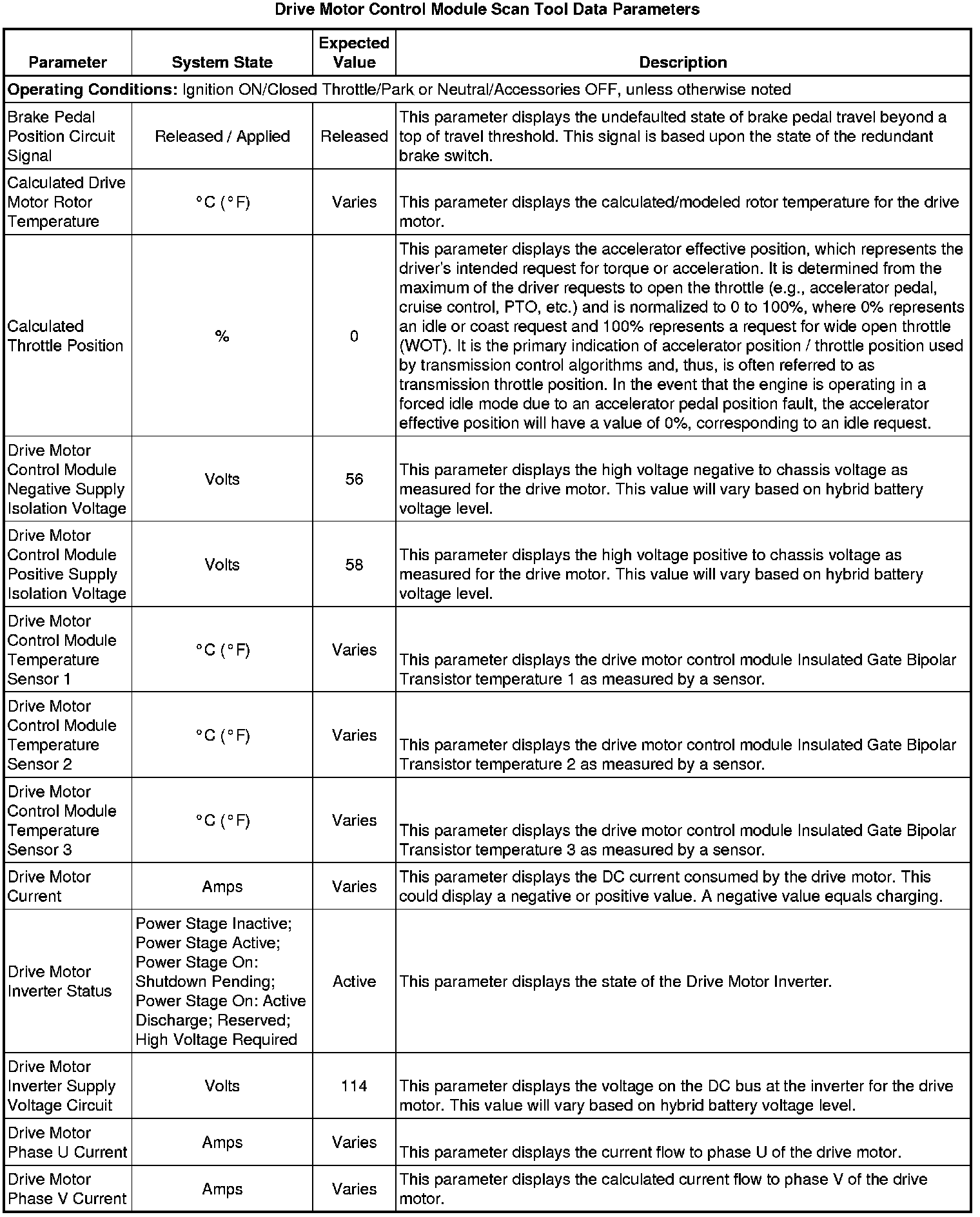 The scan tool values from a properly running vehicle may be used for comparison with the vehicle you are diagnosing. The Drive Motor Control Module Scan Tool Data Parameters list represents values that would be seen on a normally running vehicle.
