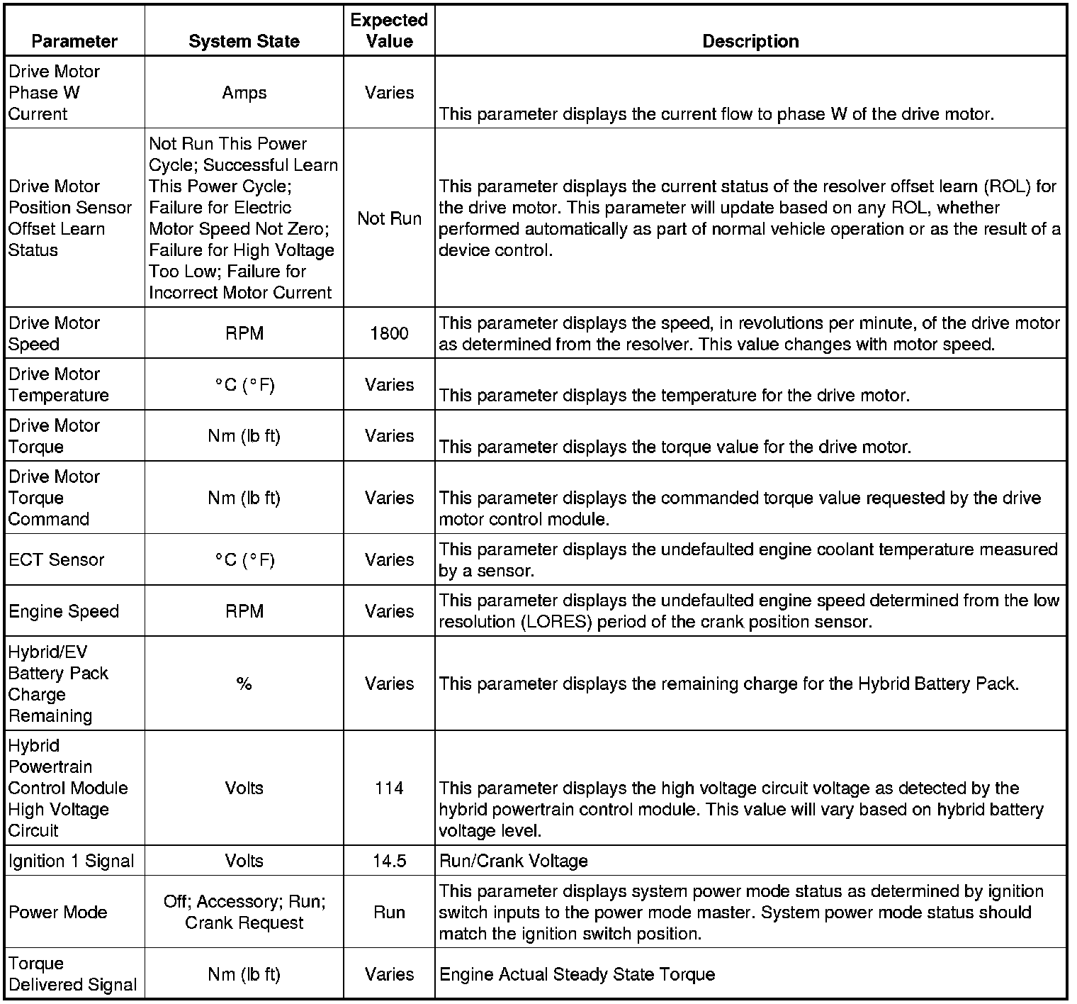 Only the parameters listed below are referenced in this service manual for use in diagnosis. If all values are within the typical range described below, refer to Symptoms - Hybrid Controls Symptoms - Hybrid Controls for diagnosis.