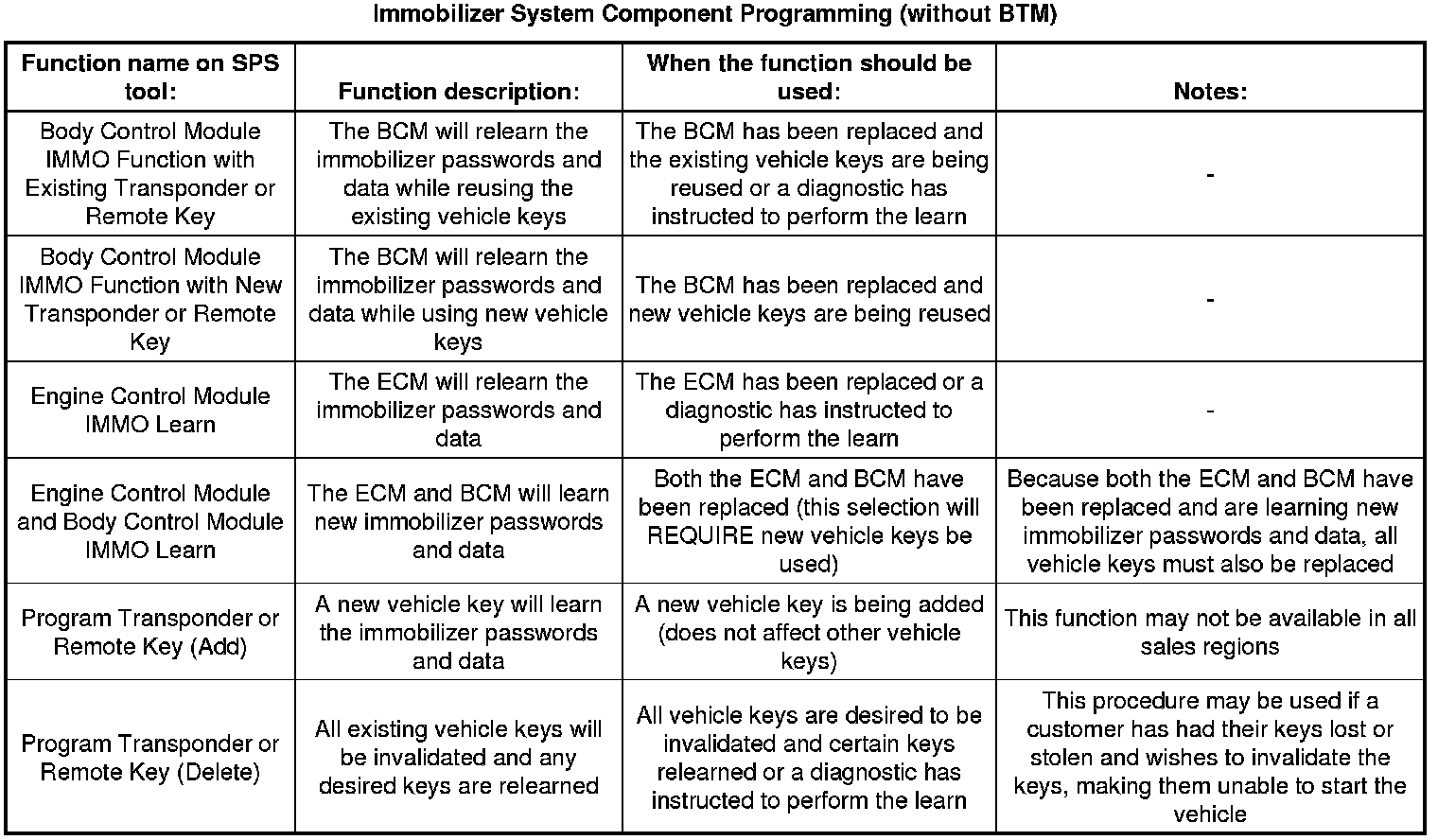 Depending on the immobilizer function being learned or the component replaced, different learn functions are required to be performed. These learn functions are as follows: