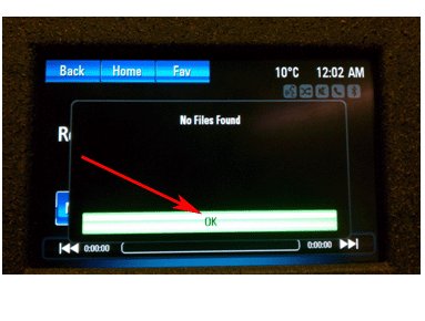 5. Insert the Jump Drive into the vehicle USB port (located inside the front floor console storage area). The radio will return a "No Files Found" message. Press OK.