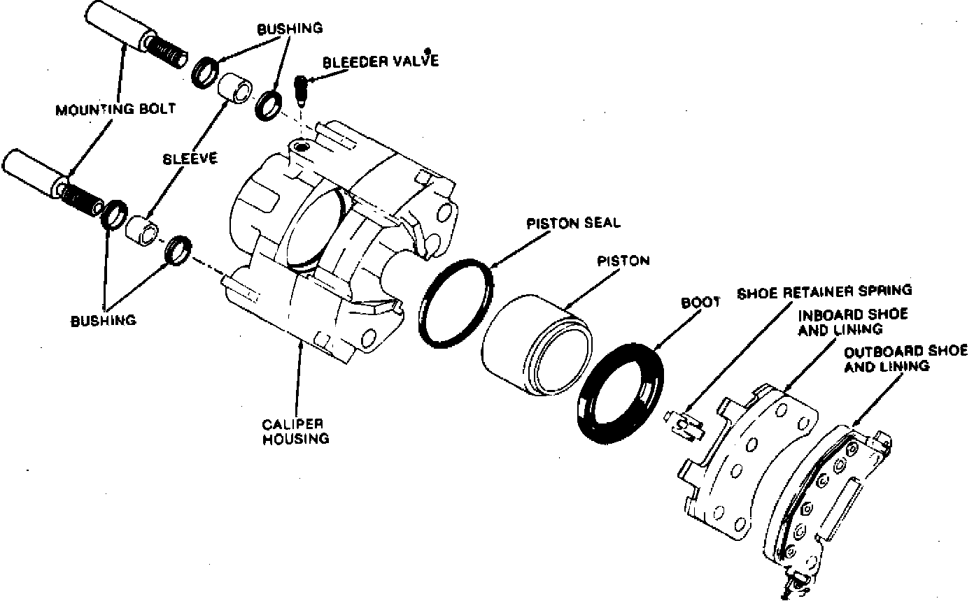 The caliper has a single piston and is mounted to the support bracket by two mounting bolts, Figs. 1 through 4. The caliper assembly slides on the two mounting bolts. Upon brake application, fluid pressure against the piston forces the inboard shoe and lining assembly against the inboard side of the disc. This action causes the caliper assembly to slide until the outboard lining comes into contact with the disc. As pressure builds up the linings are pressed against the disc with increased force.