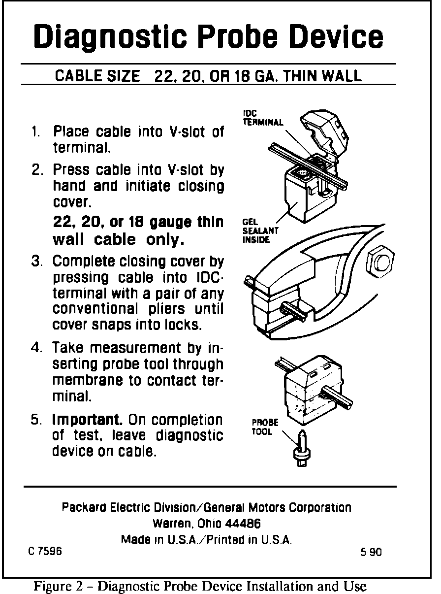 Occasionally, proper diagnosis of an electrical problem requires probing electrical circuits for voltage or resistance measurements. Most often this can be accomplished by probing the metal terminal at a connection point. However, there are times when it is easier to probe individual wires with a sharp instrument.