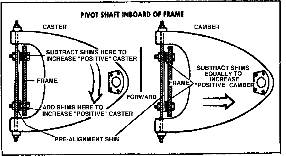 Caster and camber are adjusted by adding or removing shims from between the upper control arm and frame bracket, Fig. 1. Caster is adjusted by transfering shims from front to rear and rear to front. Transfering shims from front bolt to rear bolt will increase positive caster, from rear bolt to front bolt will increase negative caster.