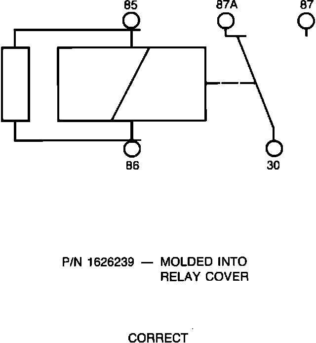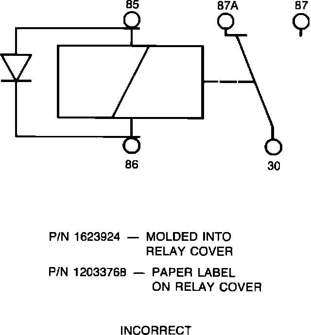 Two types of relays were packaged under P/N 1626239 by GMSPO. The correct relay will have the P/N 1626239 and the electrical schematic (Figure 1) molded into the relay cover. The incorrect relay will have P/N 12033768 on a paper label with P/N 1623924 and the electrical schematic (Figure 2) molded into the relay cover. Installing the incorrect relay in 1981-1984 vehicles equipped with 6.0 liter engines (V-8/6/4) as a fuel pump relay will immediately damage the ECM and set a code 20.