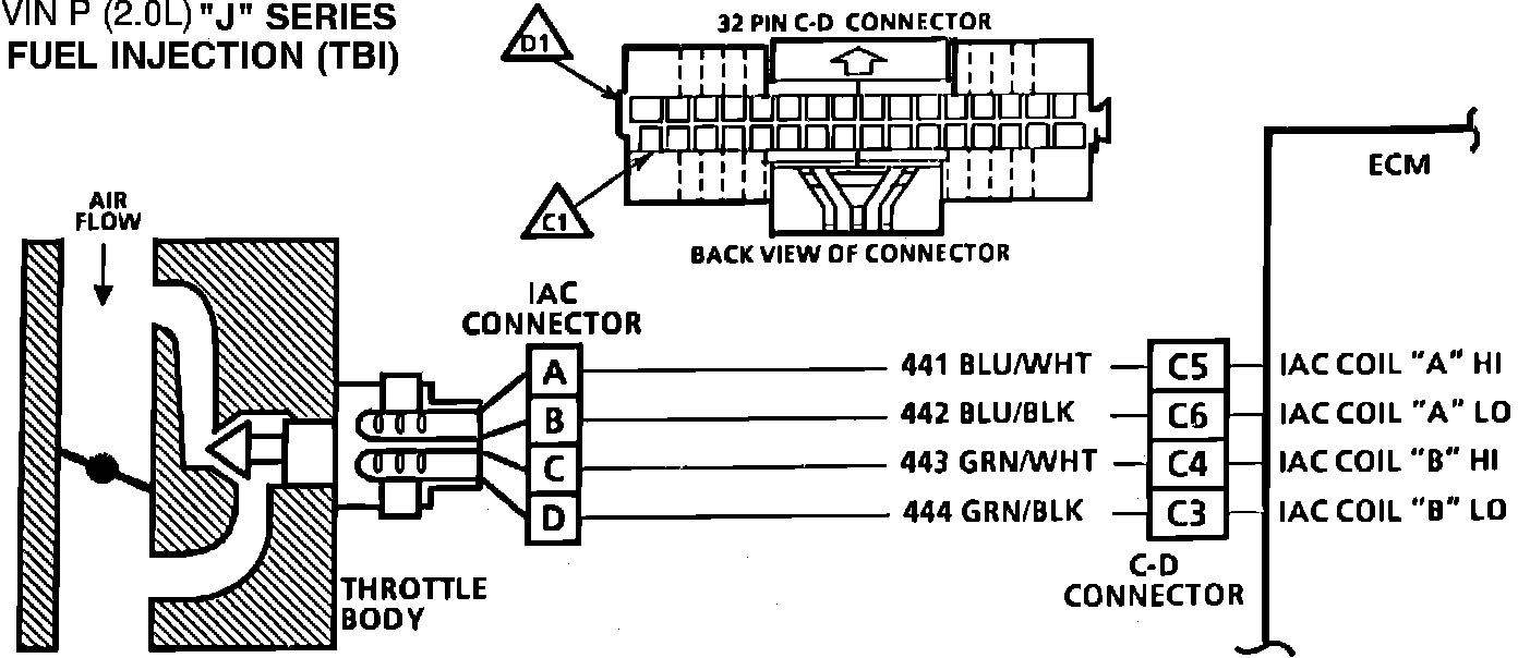 The ECM controls engine idle speed by moving the IAC valve, to control air flow around the throttle plate. It does this by sending voltage pulses (called "counts" or "steps") to the proper motor winding. The motor shaft and valve move a given distance for each pulse received.