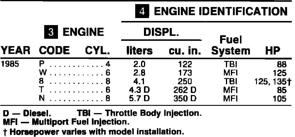 (4) ENGINE IDENTIFICATION: On the line where the engine code appears, read to the right to identify the engine.