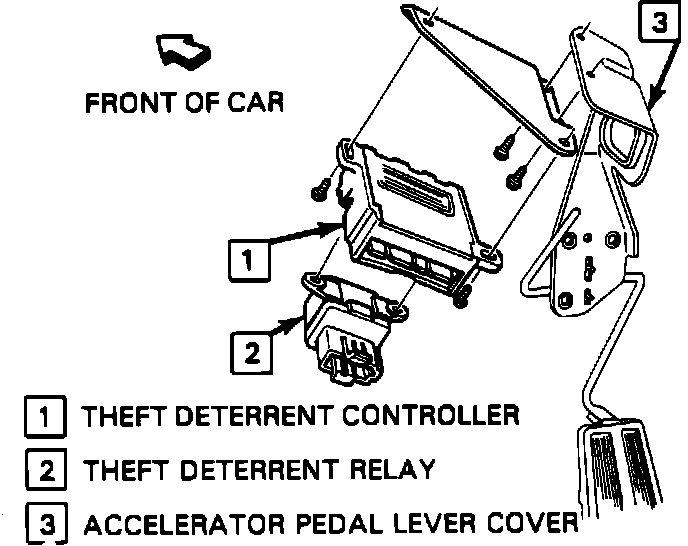 4. Remove 2 screws securing theft deterrent bracket to accelerator pedal lever plate.