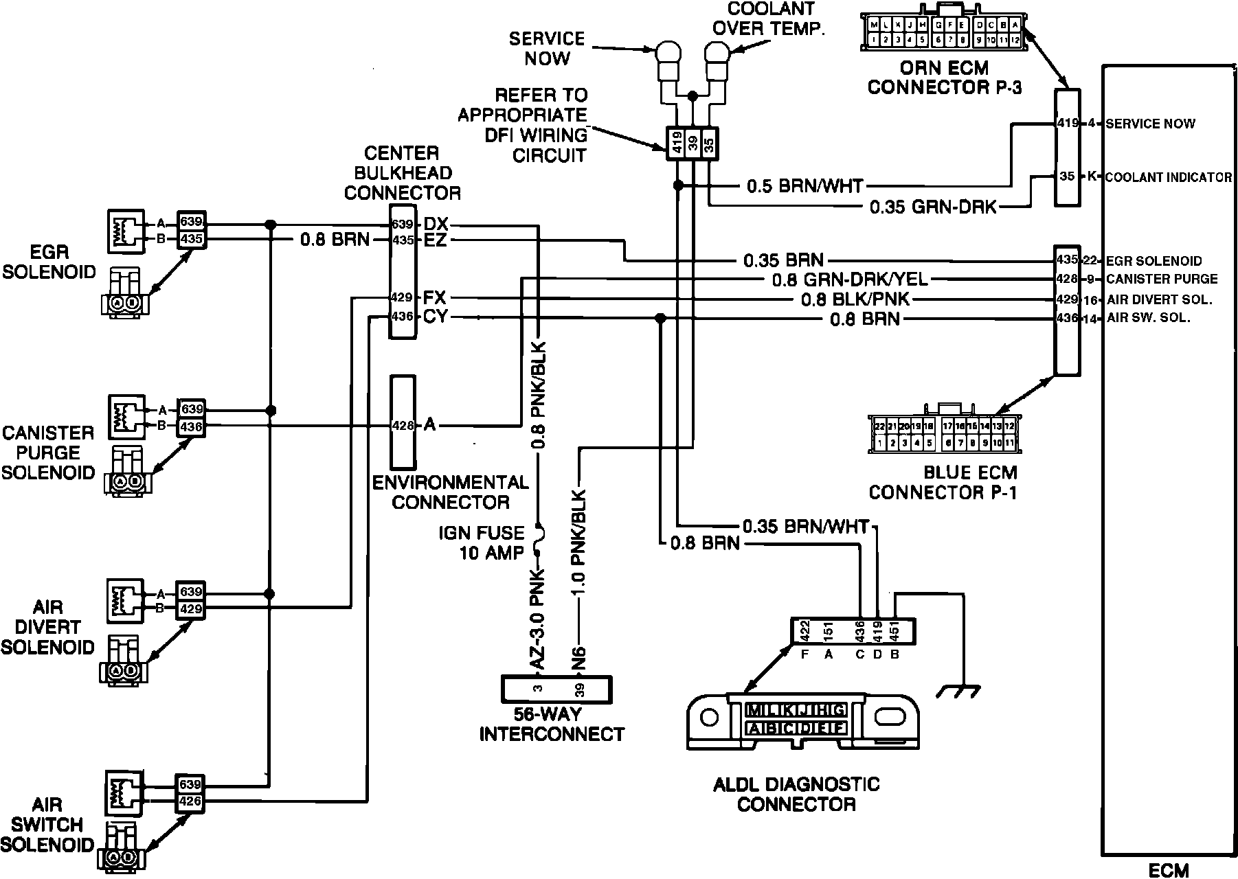 5. If lamp does not light, check 10 amp ignition fuse. If fuse is blown, repair short to ground in circuit 639 and replace fuse. If fuse is not blown, check for open in circuits 639 and 428. If circuits are satisfactory, measure resistance across canister purge solenoid in both directions. If both readings are less than 20 ohms, replace solenoid and ECM. If either reading is greater than 20 ohms, check for a faulty ECM or ECM connector and repair or replace as necessary.