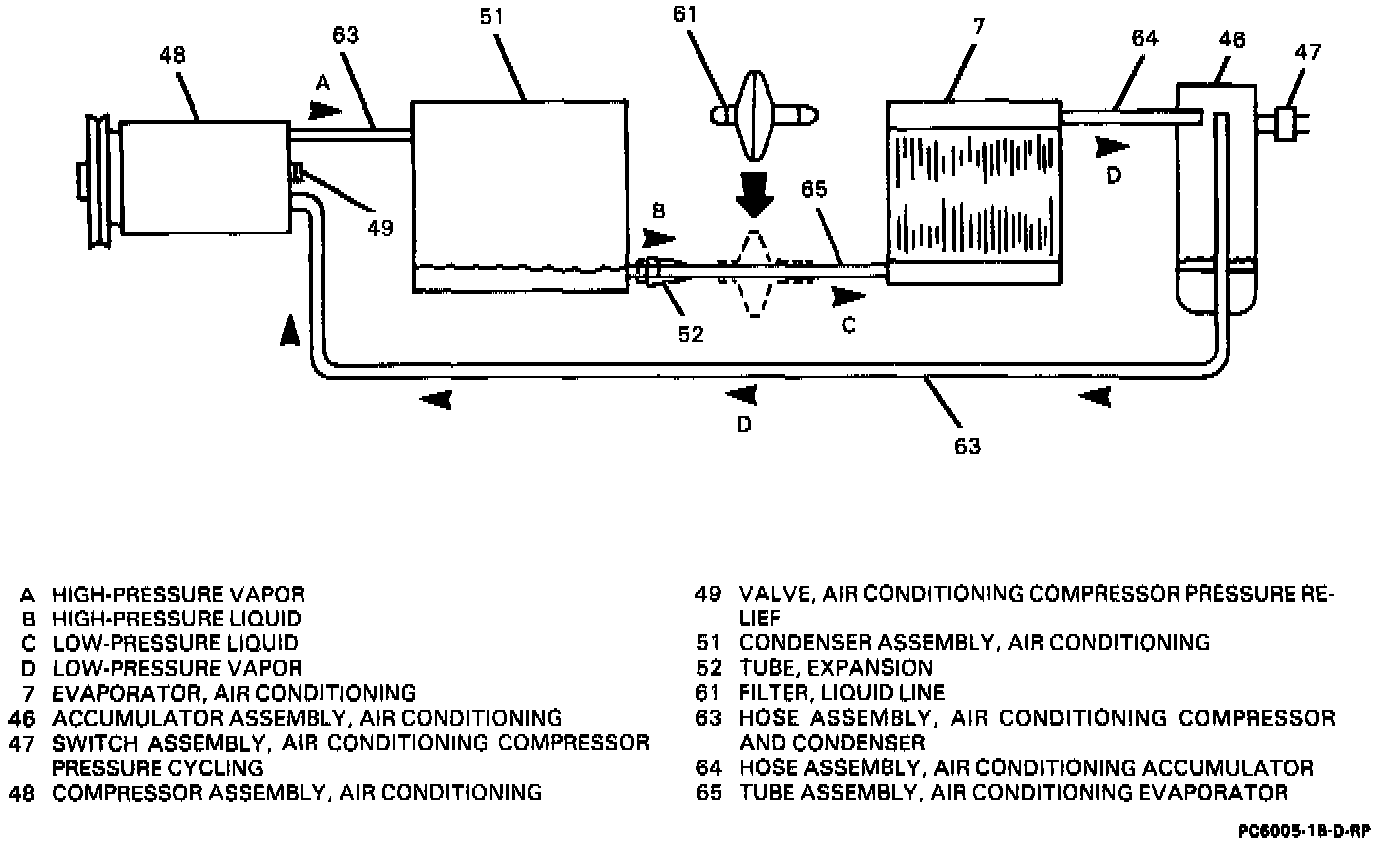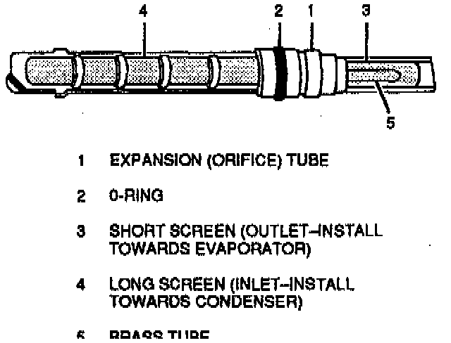 The expansion (orifice) tube (52) provides resistance to the high pressure liquid, thereby controlling the flow of refrigerant to the evaporator and allowing it to enter the evaporator as a low pressure liquid. There is also a fine mesh screen located at the expansion tube inlet, which acts as a strainer for refrigerant flowing through it.