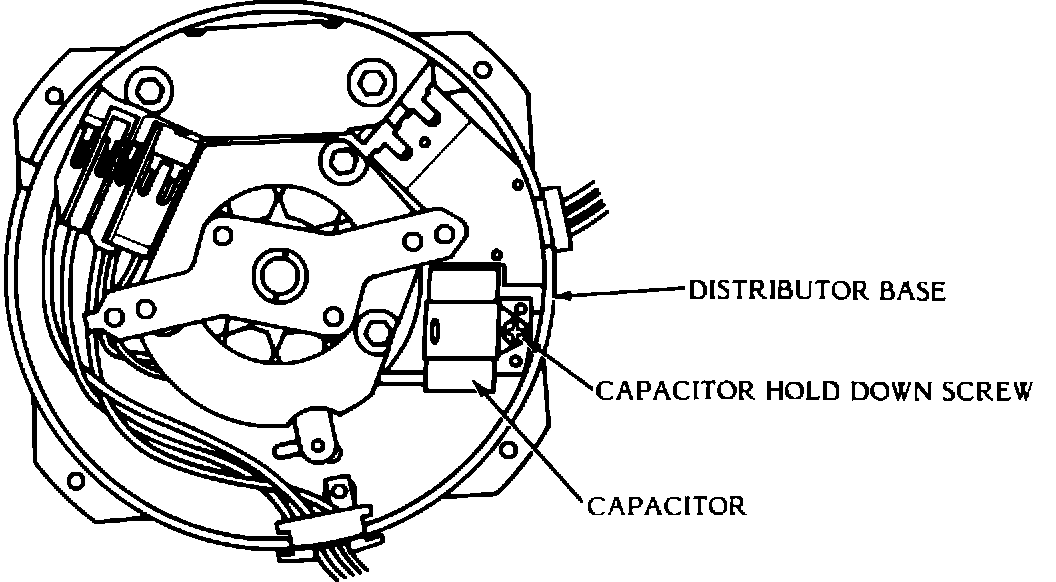 The cause of this condition may be a poor ground connection between the capacitor and distributor base due to a loose or cross threaded hold down screw (See Figure 1). To repair this condition, make sure there is a star washer under the head of the hold down screw and tighten screw.