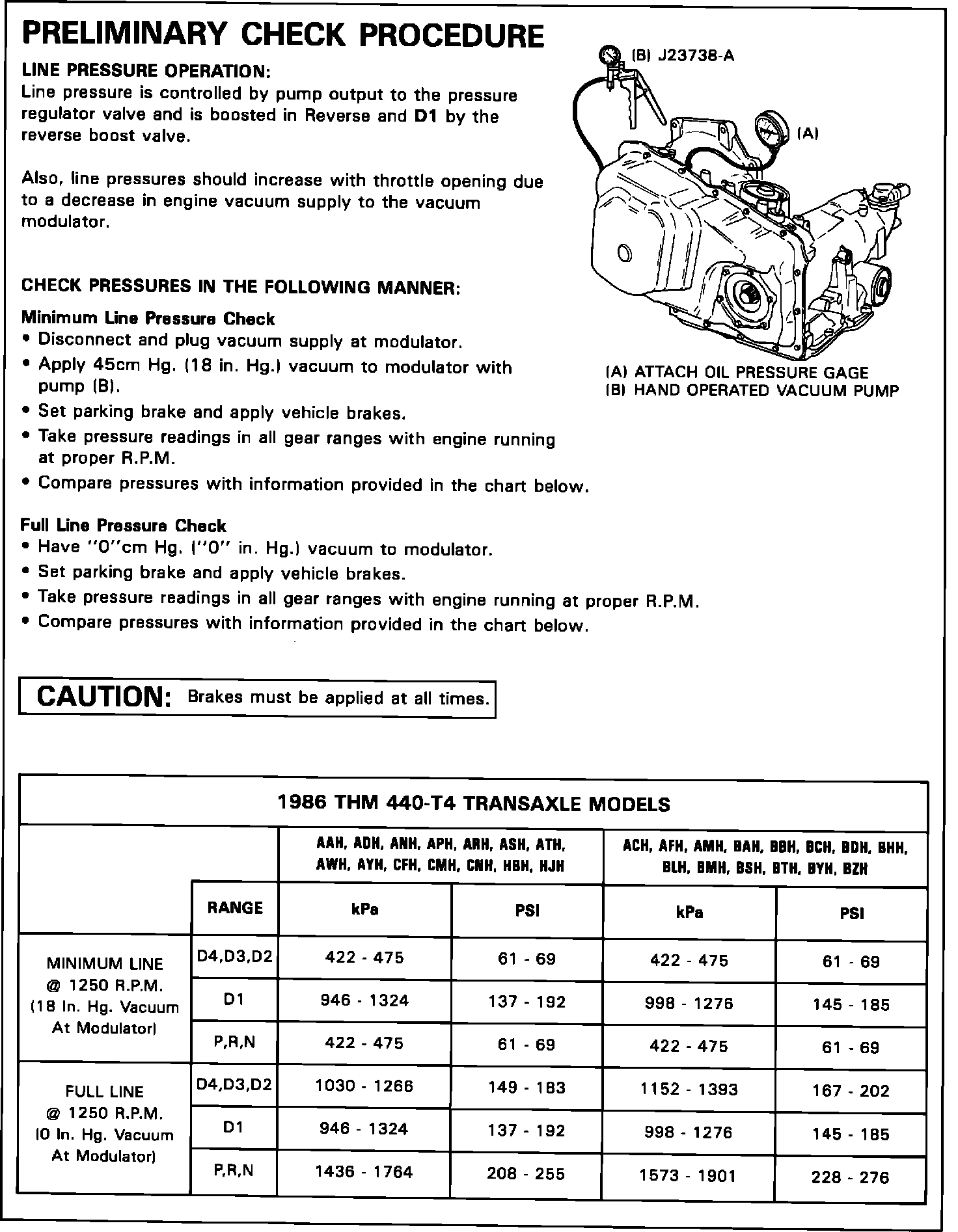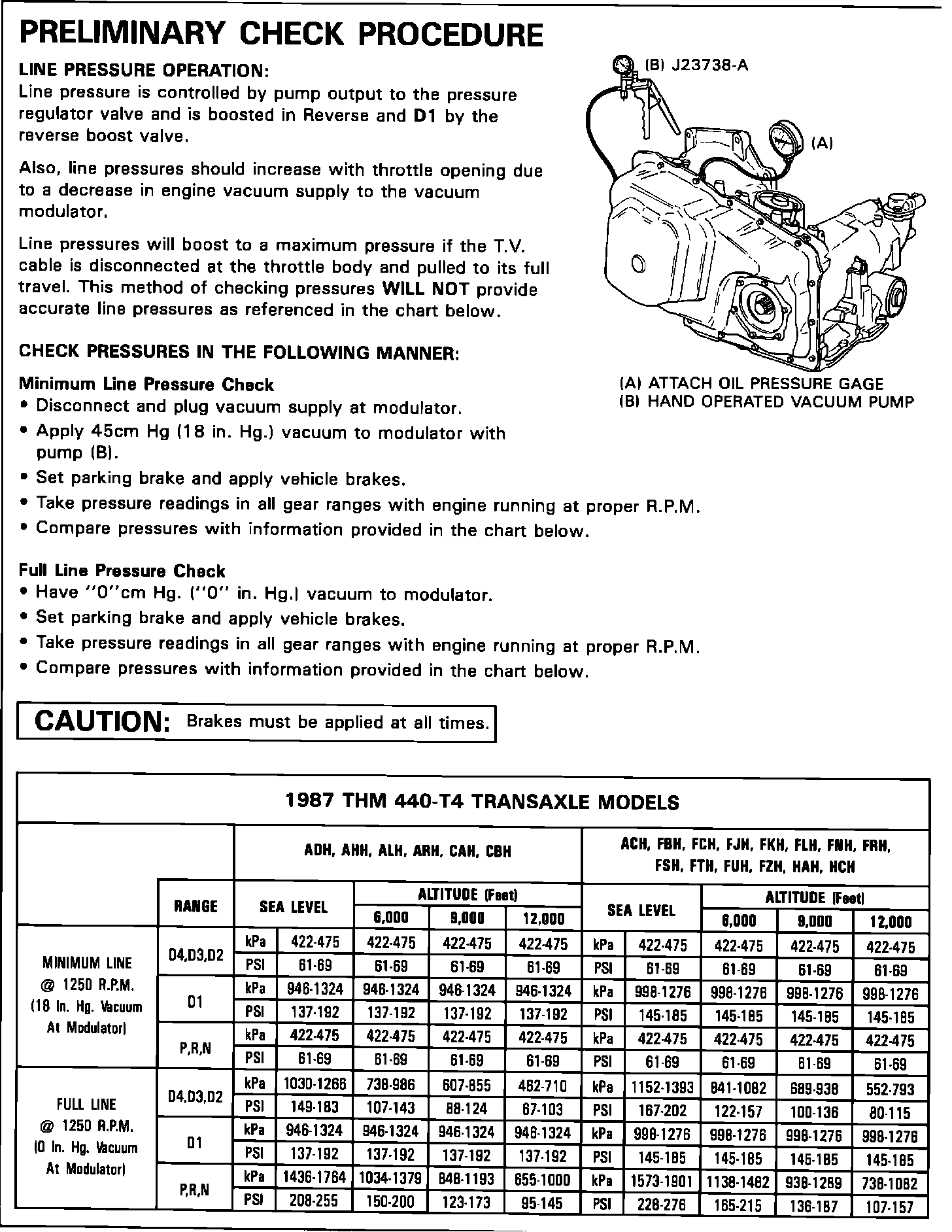 NOTE: When checking line pressure on a 1987 THM 440-T4 transaxle, it is important to follow the steps as described in the Preliminary Check Procedure in Figure 2. Using the TV cable to check maximum line pressures WILL NOT provide the accurate readings referenced in the range pressure chart. Since the introduction of the aneroid vacuum modulator, detente oil seats the #14 check ball against modulator pressure and then becomes effective on the line boost valve, in place of modulator pressure.