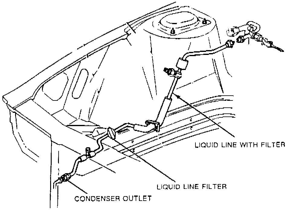 Aftermarket AC filters are located between condenser assembly outlet tube and evaporator inlet port connection at the cowl.
