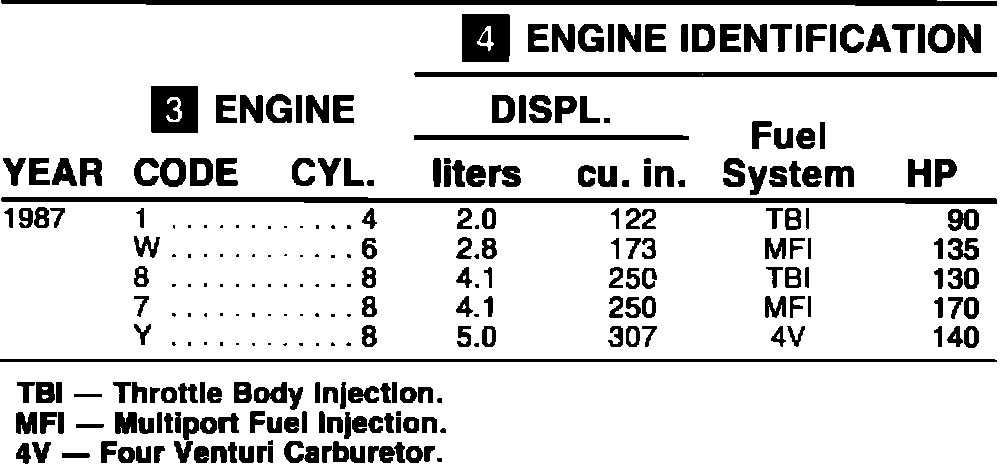 (4) ENGINE IDENTIFICATION: On the line where the engine code appears, read to the right to identify the engine.