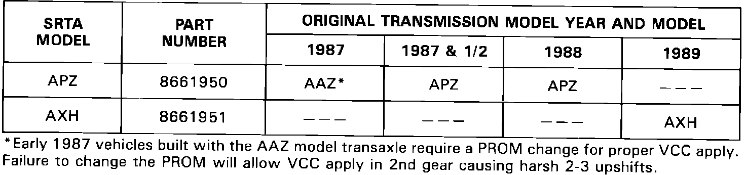 Effective August 1, 1988 the THM F-7 Service and Exchange Program outlined in Cadillac Serviceman Bulletin T-87-80 was replaced with a SRTA Program. Similar to the THM 440T4 SRTA Program, THM F-7 models may be ordered from your local General Motors Service Parts Operation (GMSPO) Parts Distribution Center. Transaxles are available for 1987 through 1989 vehicles.