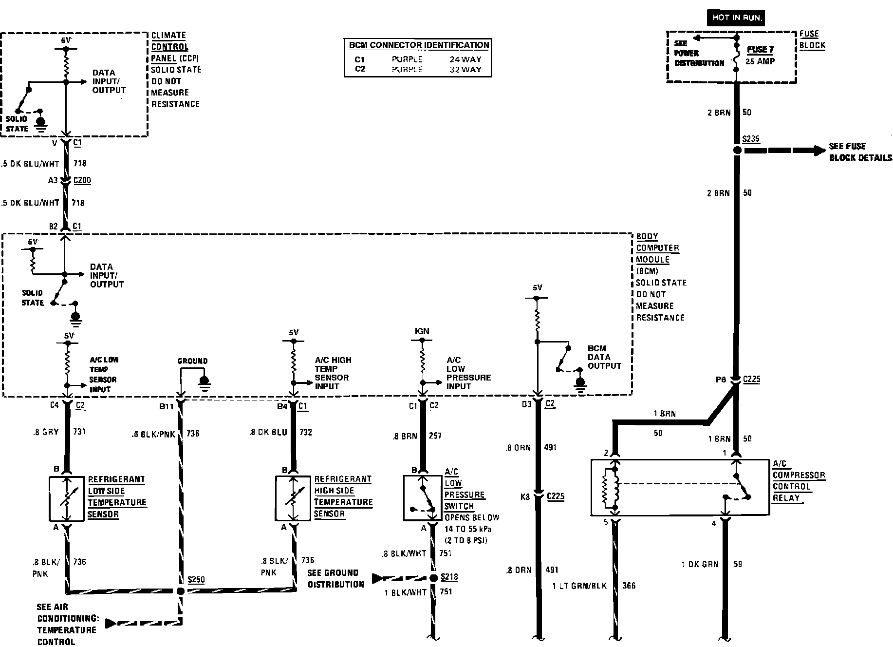 The Climate Control Panel (CCP) accepts input requests from the driver via the front panel push buttons. The input signals determine the operating mode for the climate control system and are sent to the Body Control Module (BCM) over a data line (Circuit 718). If the BCM senses that cooling is required, it will signal the Engine Control Module (ECM) to turn on the compressor through a data line (Circuit 491).