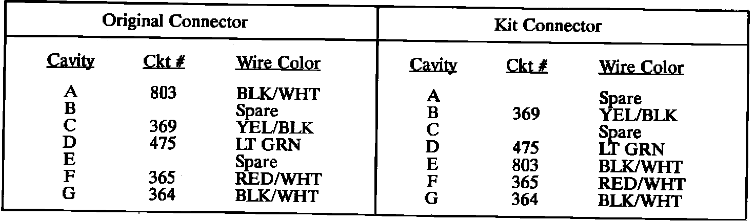 13. Transfer circuits from seven-way connector at heated windshield power module to connector provided with kit. Refer to chart for revised orientation of circuit locations in connector.