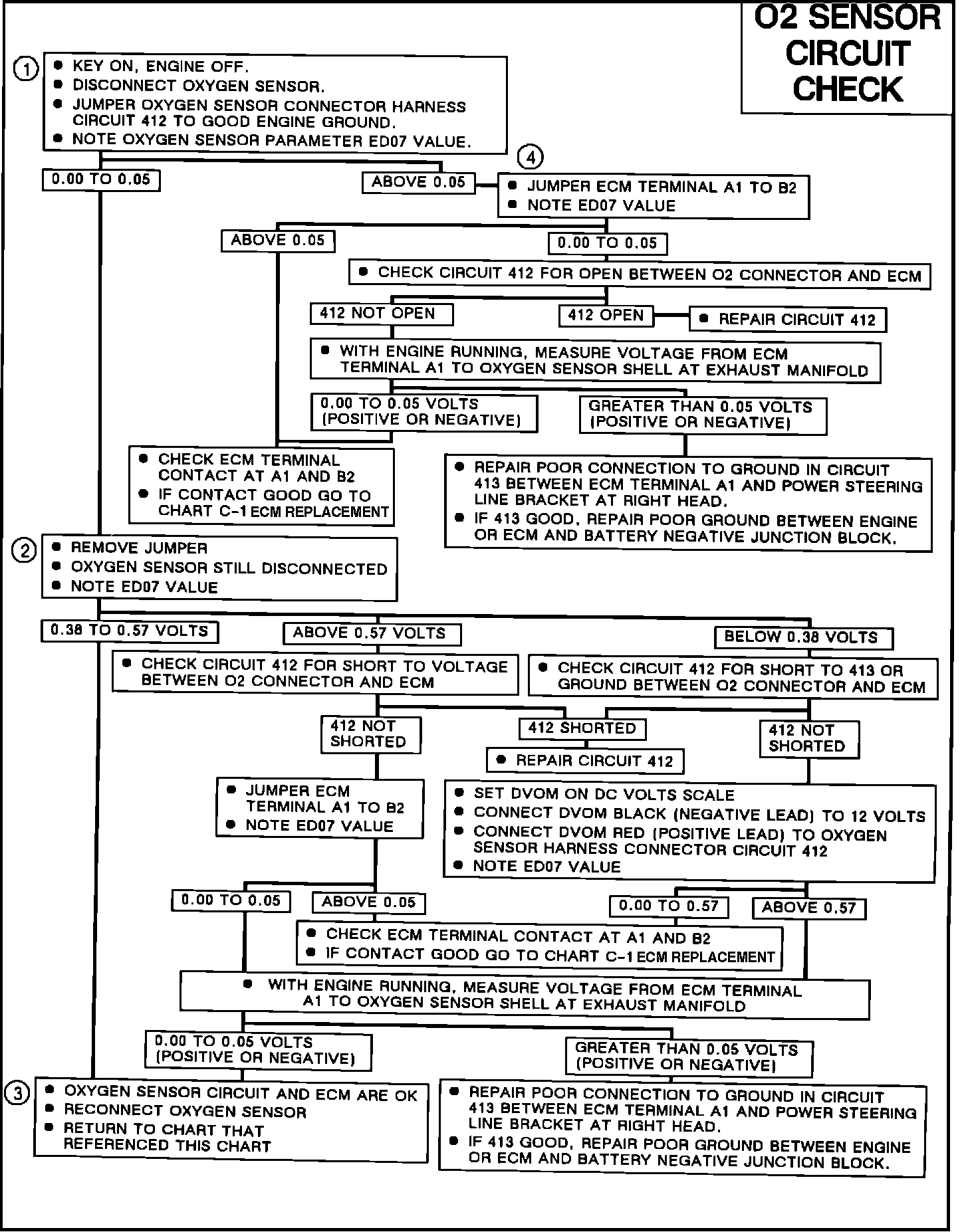 1. The ECM compares voltage on CKT 412 to the ground voltage on CKT 413. It is essential that the oxygen sensor ground and ECM ground on pin A-1 show good continuity.