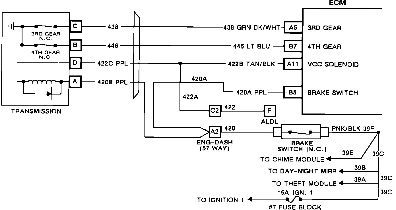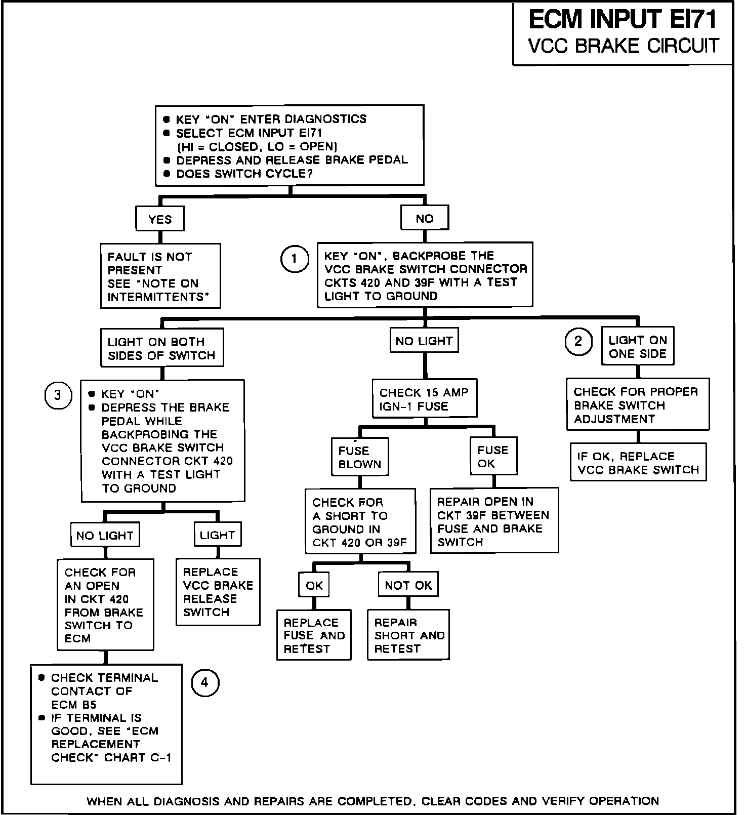 The VCC brake switch is normally closed and opens when the brake pedal is depressed. The VCC brake switch serves a dual function, the brake switch supplies power to the VCC solenoid and a brake switch receives 12 volts from the 15 AMP "IGN 1" fuse on CKT 39 and sends the 12 volt signal to the ECM and VCC solenoid on CKT 420. When the brake is depressed, the switch opens and CKT 420 voltage is read by the ECM as 0 volts.