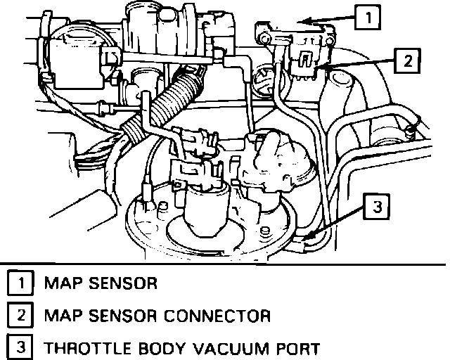 The Manifold Absolute Pressure (MAP) sensor measures the changes in intake manifold pressure which results from engine load and speed changes. The sensor converts a pressure input to a voltage output. The MAP sensor output voltage signal is directly related to pressure (kPa). A high pressure (atmospheric pressure) will produce an output of about 4.5 to 5.0 volts. A low pressure will produce about 0.5 to 0.9 volts. Manifold absolute pressure is the opposite of what you would measure with a vacuum gauge. When manifold pressure is high, vacuum is low.