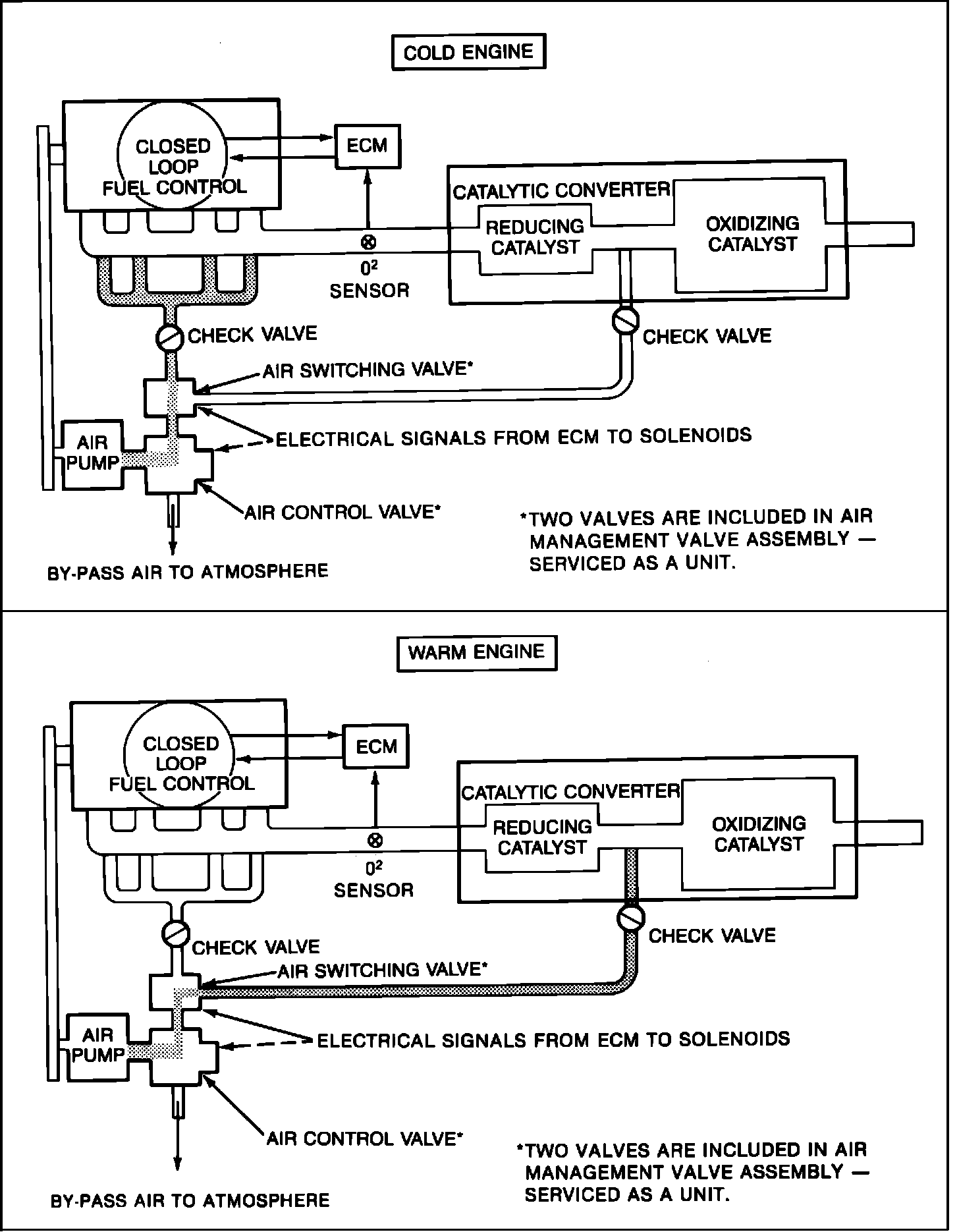 The control valve assembly combines both the divert function and the air switching function in one housing. The air control valve provides air divert to the air cleaner for converter protection or directs air to the switching valve. The air switching valve directs the air to the exhaust manifold during cold engine operation. It directs air to the converter bed when the system is in closed loop. When divert is needed, the ECM turns off the divert solenoid in the air control valve assembly, forcing air to be diverted to the air cleaner.