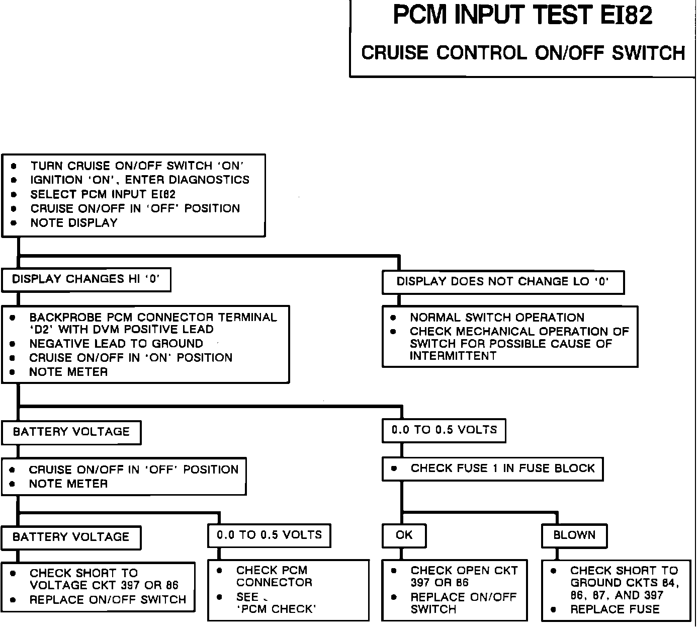 After the diagnostic trouble codes have been displayed, the Driver Information Center (DIC) will display "ECM?". Depress the HI blower button. The display will change to read PCM/ECM data. Depress the LO blower button. The display will change to read PCM/ECM inputs. Depress the HI blower button. The display will change to read C/C BRAKE EI70. Place the cruise control ON/OFF switch in the ON position. Depress the LO blower button four times. The display will change to read LO 0 C/C ON/OFF EI82. When the cruise control ON/OFF switch is placed in the ON position the display will change to read HI X. The change from 0 to X indicates that the test has been successfully completed.