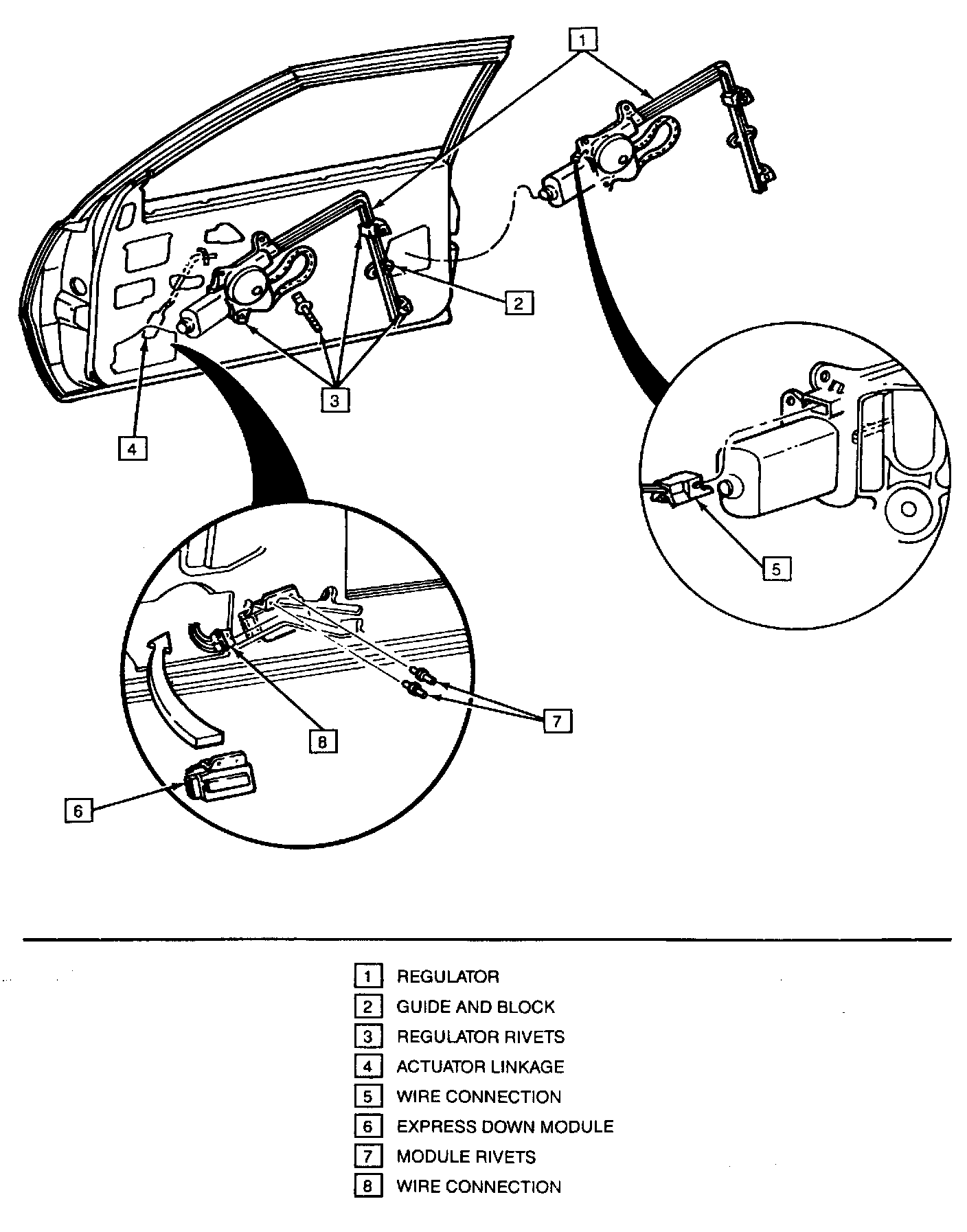 4. Regulator guide and block assembly from lower sash channel by positioning window half way down, and pushing regulator forward. Once removed, tape glass in full up position.