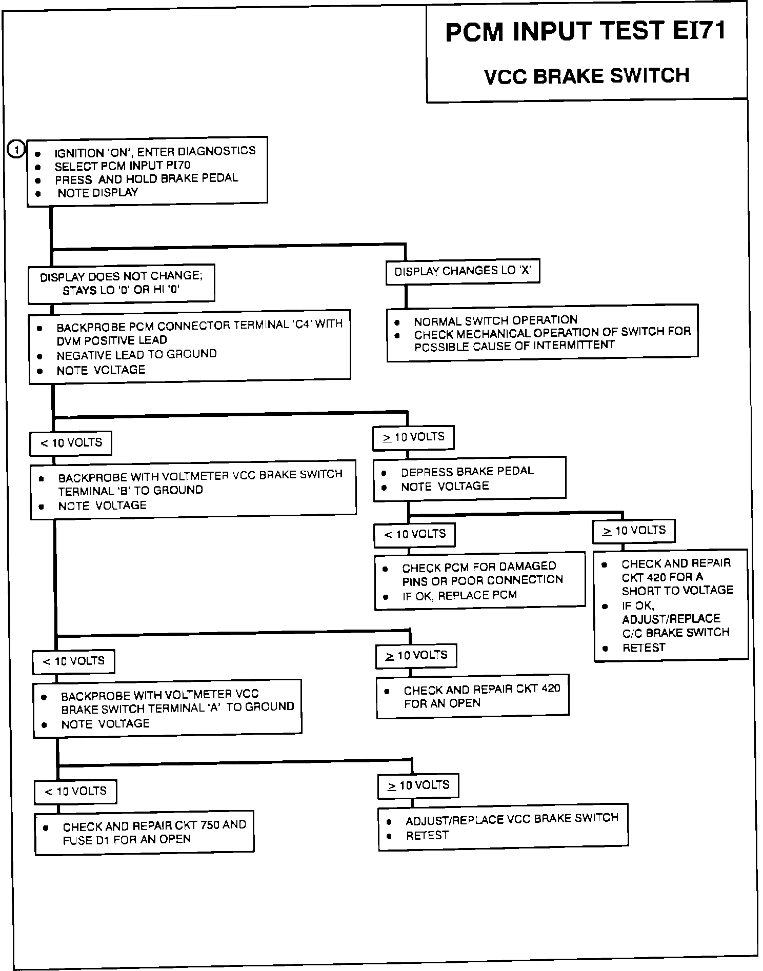 After the diagnostic trouble codes have been displayed the Driver Information Center (DIC) will display "ECM?". Depress the HI blower button. The display will change to read "ECM DATA?". Depress the LO blower button. The display will change to read "ECM INPUTS?". Depress the HI blower button. The display will change to read EI70. Depress the LO blower button. The display will change to read HI '0' EI71. When the brake pedal is depressed and released the display will change to read LO 'X'. The change from '0' to 'X' indicates that the test has been successfully completed.